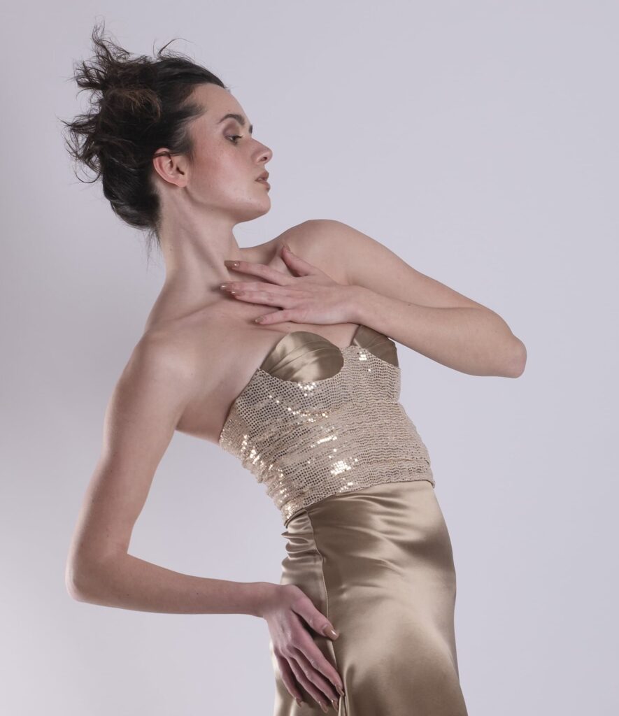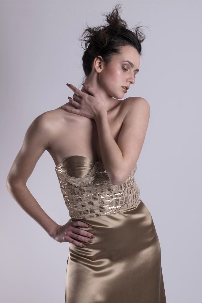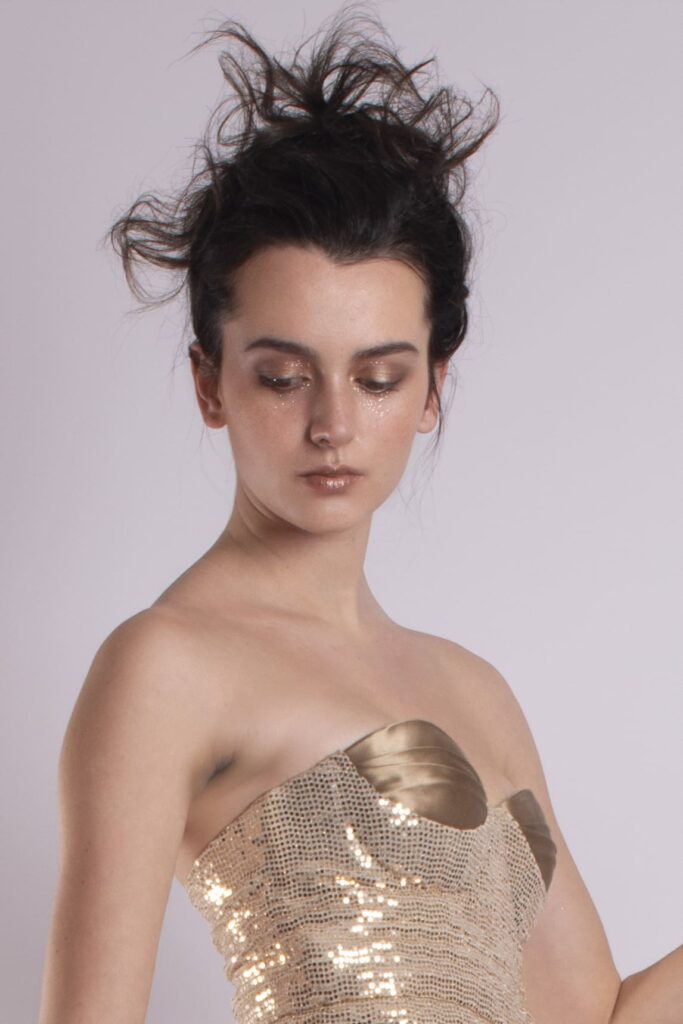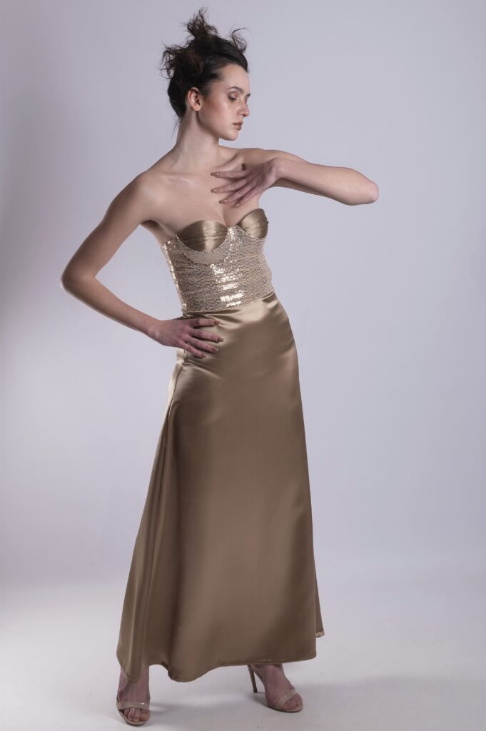 The strapless corset is made of gold sequins, lightly structured to hug the body without stiffening it.